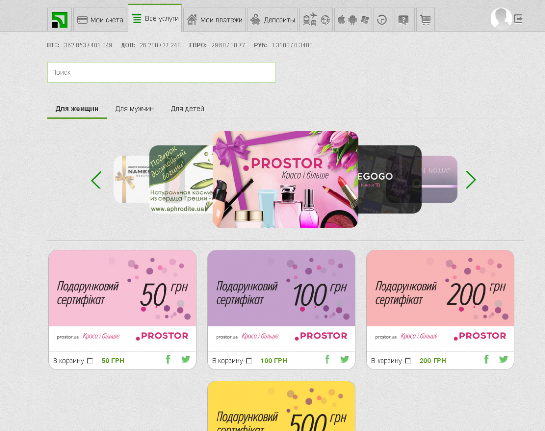 Теперь, воспользовавшись услугой Gift Card от «ПриватБанка», пользователь сможет купить электронный подарочный сертификат от PROSTOR и отправить его по электронной почте или Sender