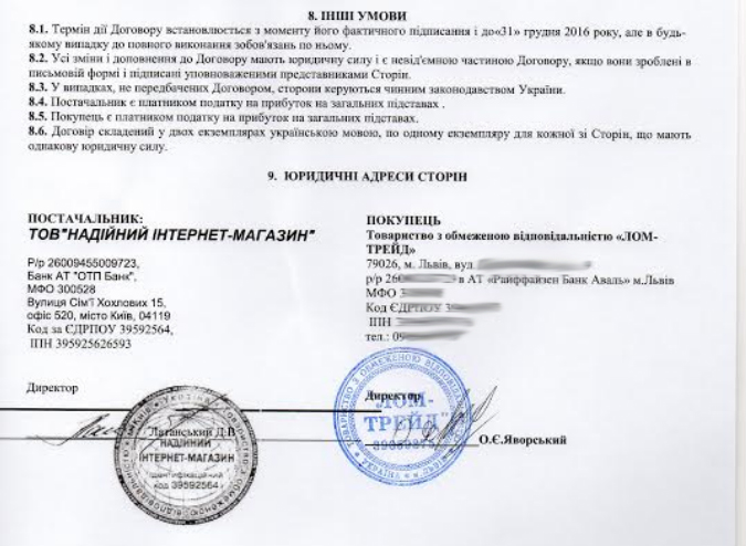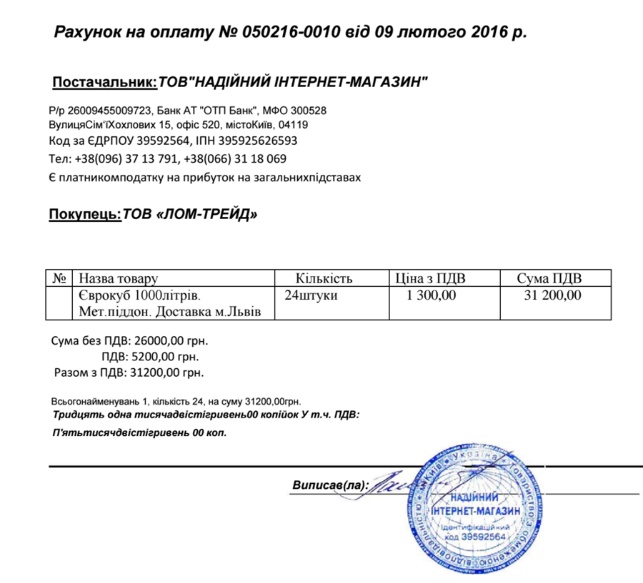 И пример поддельного счета (суммы не совпадают, потому что в данном случае была договоренность о предоплате в размере 7244 грн):