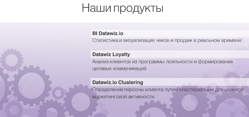 Сейчас у нас есть три продукта. Первый — BI Datawiz.io — флагманский продукт, который умеет делать статистику, визуализирует чеки, дает возможность проводить ABC-, XYZ-анализ и многое другое. Также этот продукт позволяет осуществлять аналитику корзин. Мы можем сказать, какие корзины есть у ритейлера, как они зависят друг от друга, как с ними нужно работать.