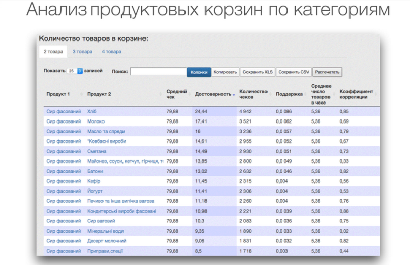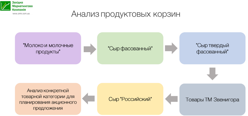 Что мы делаем? Ищем популярный товар, который приведет нас к корзинам с более высоким средним чеком. Мы увидели, что ТМ «Звенигора» — лидер продаж непосредственно в группе продаж «Молочная продукция» — «Сыр фасованный твердый». Также мы можем посмотреть корзину, с какими другими товарами покупают популярный товар. Выяснилось, что «Сыр фасованный» чаще всего покупают с продуктами так называемого бутербродного набора — масло, хлеб, колбаса. Хочу обратить внимание на средний чек. Вы видите, что в корзине, где присутствует товар «Сыр фасованный», средний чек — около 80 грн.