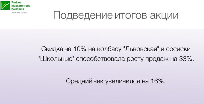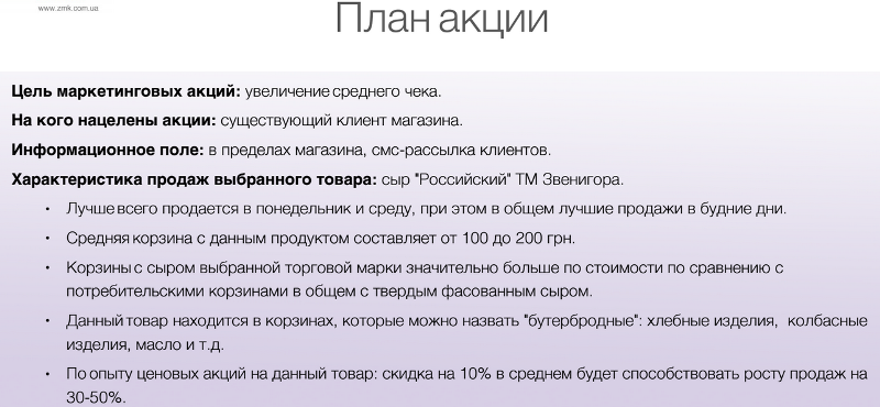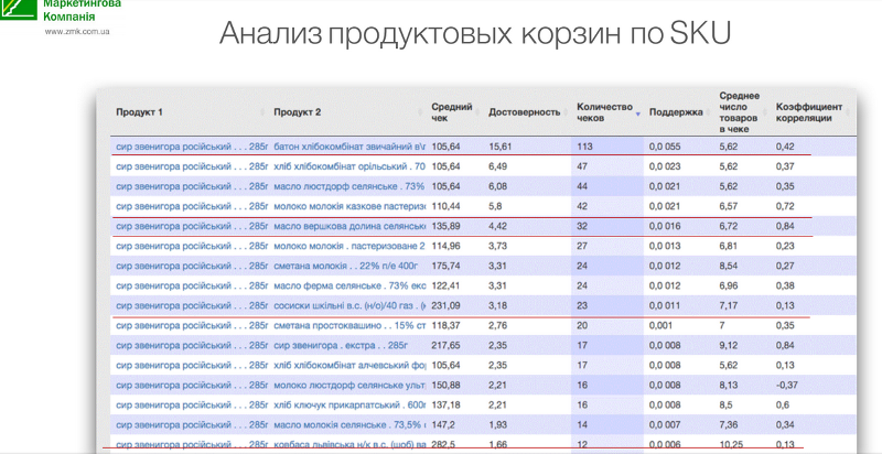 Смотрим на чеки, которые больше 100 грн, и самую большую акцию проводим по большим чекам — это 230 и 280 грн. Мы выбрали товар, корзину, определили корзины, которые нам интересны, и, чтобы увеличить частоту покупок в корзинах с высоким средним чеком, проводим акцию.