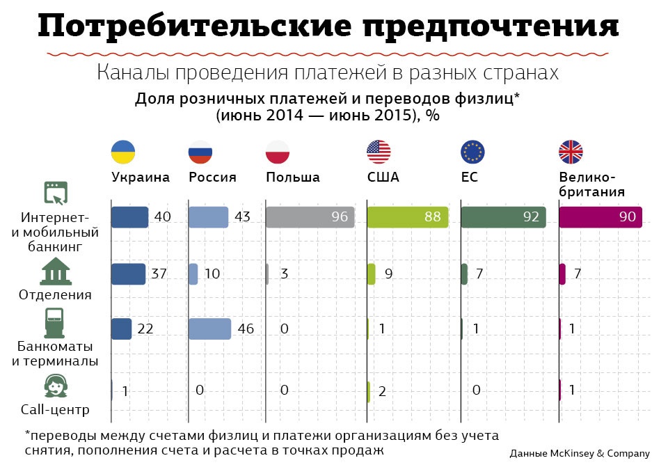 Но отечественным финансистам и их клиентам еще есть куда расти: по данным консалтинговой компании McKinsey&Company, сегодня с помощью компьютеров и гаджетов украинцы проводят около 40 % расчетов. В Польше же, к примеру, через цифровые каналы проходит 96 % розничных платежей и переводов средств.
