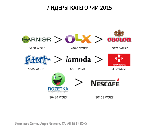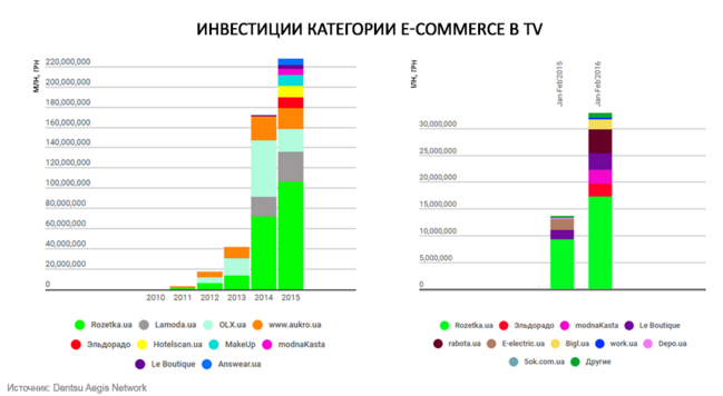 Активным построением знания игроки e-commerce начали заниматься еще до введения 3G-сетей. Трехкратный рост инвестиций в 2014 году и дальнейшее увеличение активности игроков в 2015 — начале 2016 года свидетельствуют об увеличении конкуренции в украинском e-commerce, несмотря на кризисные процессы в экономике. Для большего охвата потенциальных покупателей бренды использовали ТВ-размещение. Ребрендинг Slando на OLX, рекламная кампания маркетплейса Aukro.ua, запуск онлайн-ритейлера Lamoda.ua и традиционно высокая активность Rozetka.ua стали основными условиями для роста категории и определения лидеров в 2014-2015 годах.