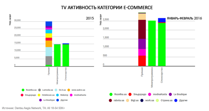 Для достижения высших показателей узнаваемости игроки e-commerce отдают предпочтение прямой рекламе, за исключением Rozetka.ua — лидера по объему рекламных бюджетов в 2015-начале 2016, который делает основной акцент на межпрограммное размещение и спонсорскую поддержку.