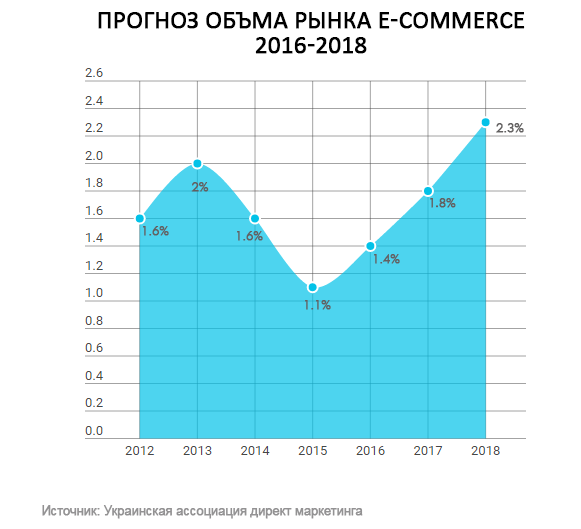Согласно прогнозу Украинской ассоциации директ-маркетинга, украинский рынок e-commerce сохранит позитивную динамику в 2016–2018, ежегодно приращивая 1,4–2,3%.