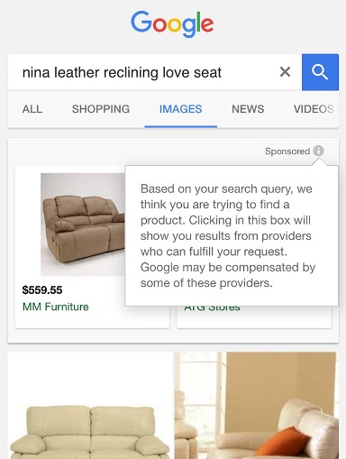 «Основываясь на вашем поисковом запросе, мы решили, что вы пытаетесь найти этот товар. Кликнув по этому блоку, вы увидите список компаний, которые смогут удовлетворить ваш запрос», — объясняет Google во вкладке Sponsored.