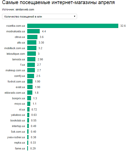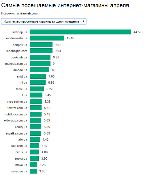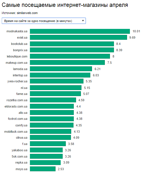 В апреле интернет-магазины сократили число посещений. Если у лидера рейтинга Rozetka.ua в марте было 35,8 млн посещений, то в апреле аудитория сократилась до 32,6 млн. За прошлый месяц аудитория ModnaKasta.ua сократилась на 0,8 млн посещений. У шедшего на третьем месте в марте Мobilluck.com.ua в апреле стало на 0,6 млн посещений меньше и интернет-магазин занял пятую строчку рейтинга. Сitrus.uа занимает третью строчку с показателем 3,6 млн, сократив количество просмотров сайта всего на 0,1 млн. ModnaKasta вышла на первое место по времени, проводимому пользователями на сайте (в среднем 10,01 минут), а по количеству просмотров с большим отрывом лидирует интернет-магазин обуви Intertop.ua, у которого за одно посещение пользователь просматривает 45 страниц