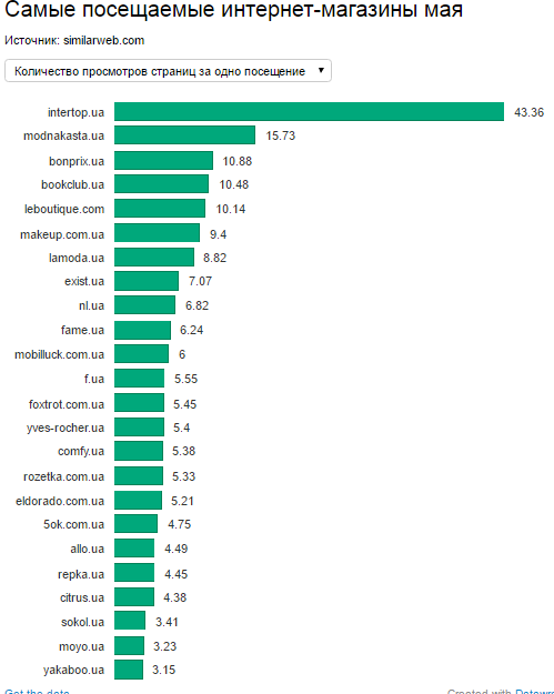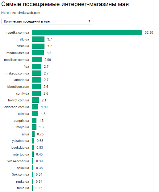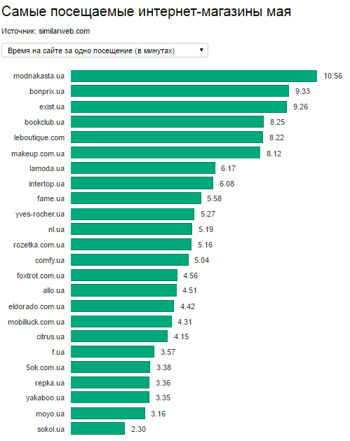 В мае интернет-магазин modnakasta.ua переместился со второго на четвертое место. За прошлый месяц аудитория ModnaKasta.ua сократилась на 0,9 млн посещений. У лидера рейтинга Rozetka.ua в апреле было 32,6 млн посещений, в мае аудитория незначительно уменьшилась — до 32,3 млн. Allo.ua и Сitrus.uа поделили вторую и третью строчку с показателем 3,7 млн, увеличив количество просмотров. ModnaKasta сохранила первое место по времени, проводимому пользователями на сайте (в среднем 10,56 мин), а по количеству просмотров с большим отрывом лидирует интернет-магазин обуви Intertop.ua, у которого за одно посещение пользователь просматривает 43 страницы