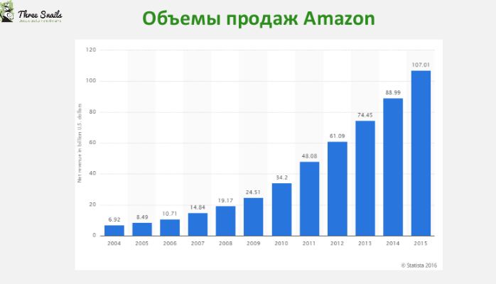 Для сравнения — динамика роста Amazon: в 2015 году выручка составила $107 млрд.