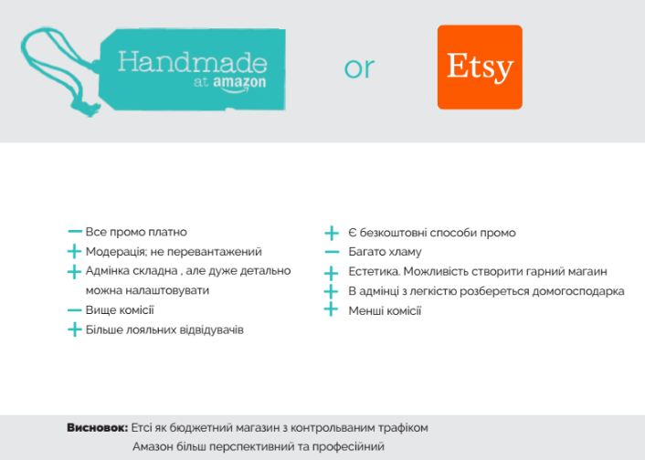 Преимуществами площадки Handmade at Amazon, по словам Мисник, являются доверие пользователей, быстрый рост нового ресурса, модерация, благодаря которой отсеивается «хлам». На площадке достаточно просто начать работать, при возникновении проблем оперативно отвечает служба поддержки. Из минусов можно отметить неудобство приема платежей для украинцев и доставку из Украины.