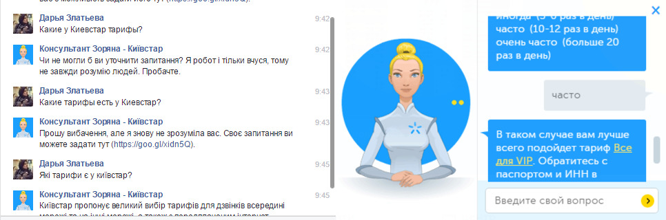 Недавно телеком-оператор «Киевстар» запустил в Facebook первого в Украине сервисного чат-бота Зоряну — она отвечает на вопросы об услугах связи, тарифах, при необходимости может рассказать стихотворение. Менеджер по клиентскому сервису департамента электронных каналов «Киевстар» Надежда Багинская рассказала, что с марта с Зоряной уже успели пообщаться более 200 000 пользователей сайта. Бот не справляется только с третью запросов, и эта цифра постоянно снижается. Если клиент не получил нужный ответ, Зоряна переключает пользователя на живого оператора.
