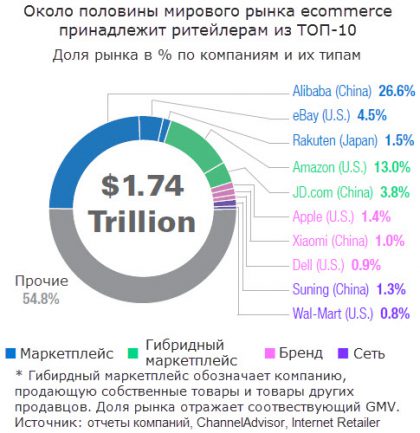Почти половина мирового рынка электронной коммерции принадлежит десяти крупнейшим e-commerce компаниям. Прирост рынка онлайн-торговли составляет почти 20% в год, а объем рынка в 2015 году составил $1,74 трлн согласно отчету Global 1000: The global reinvention of e-retail. Об этом пишет PaySpace Magazine