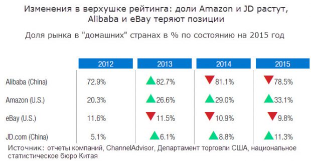 К примеру, Amazon и JD.com удается увеличивать свои доли на местных рынках, продавая собственные товары и предоставляя маркетплейсы для других продавцов. Эти две компании достигли немалого успеха: почти треть всех транзакций по онлайн-продажам в США приходится на сайты, принадлежащиеAmazon; доля JD.com на рынке Китая в 2015 году выросла до 11,3% (для сравнения — в 2012 этот показатель составлял 5,1%). Однако доля Alibaba на рынке Китая, по сравнению с 2014 годом немного сократилась — с 81,1% до 78,5% — несмотря на рост продаж примерно на 43,4% ежегодно в последние несколько лет.