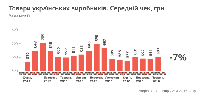 Денис Горовой, директор по развитию Prom.ua: Почему украинское? Дело отнюдь не в патриотизме. Потребитель прежде всего желает получить качественный товар по приемлемой цене. А товары украинского производства часто не уступают по качеству импортным, а иногда и превосходят их. Да и цены ниже. По крайней мере, средний чек на товары украинских производителей Prom.ua уменьшился на 7% и составляет меньше 500 гривен, что на 74% меньше, чем средняя сумма заказов по всем товарам Prom.ua (где средний чек в I квартале 2016 года — 862 грн. — Ред.).