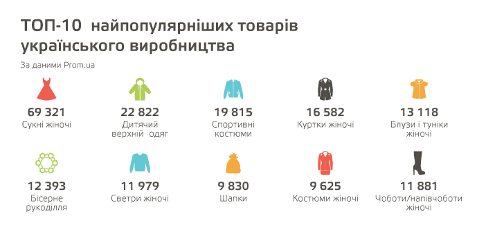 Одежда лидирует и в списке самых популярных товаров украинского производства: восемь из десяти пунктов — различные разновидности женской и детской одежды, да и оставшиеся два имеют отношение к формированию гардероба.