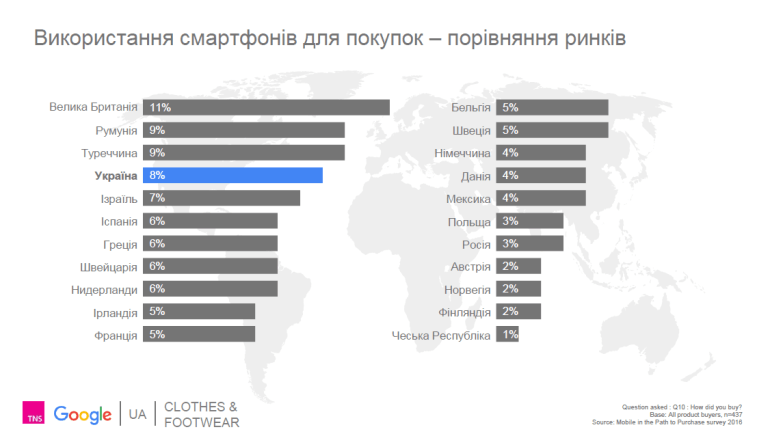 Если сравнивать с другими странами, то по поиску информации на смартфонах, Украина находится на уровне других европейских стран (в лидерах здесь Турция — 69%, Мексика — 68% и Испания — 62%), а в использовании смартфонов для покупок одежды и обуви — даже опережает многие страны (здесь впереди Великобритания 11%, Румыния и Турция — по 9%).