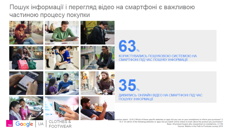 В целом, пока поиск на компьютерах превалирует над поиском информации на смартфонах (58% против 29% в категории «Одежда и обувь»). Однако исследование показывает, что онлайн-поиск и просмотр видео на смартфонах являются важными факторами в процессе покупки — перед покупкой одежды или обуви 63% украинских пользователей смартфонов использовали поисковые системы для сбора информации, а 35% смотрели онлайн-видео на смартфоне в процессе поиска. В категории средств по уходу за кожей эти цифры даже выше — 85% и 57% соответственно, а перед покупкой ноутбуков уже 91% украинских пользователей искали информацию через поисковые системы и 75% — смотрели онлайн-видео.