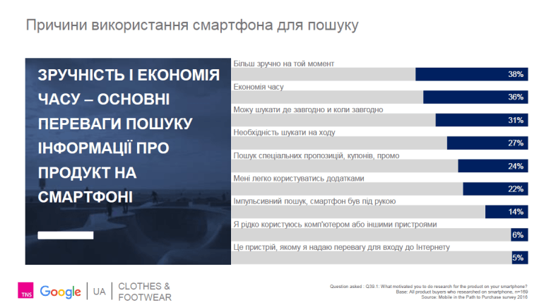 Для 38% украинских интернет-пользователей главным фактором использования смартфона для поиска информации перед покупкой является удобство, 36% считает, что смартфон помогает рационально использовать время, а 31% используют смартфон, потому что он всегда под рукой.