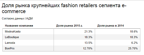 В 2015 г. в тройку лидеров вошли ModnaKasta, LeBoutique и Lamoda. В сумме топ-3 лидеров составили 53% от общего объема рынка fashion e-commerce.