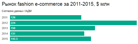 По оценке УАДМ, сегмент fashion (одежда и обувь) в e-commerce находится на втором месте по объему в денежном выражении и по итогам 2015-го составил $143 млн. Несмотря на общее падение рынка электронной коммерции в долларах на 31% в сравнении с 2014 годом ($1,6 млрд), сегмент fashion продемонстрировал рост как в гривне, так и в долларе. В долларах рост составляет 9%, при этом объем рынка в гривне удвоился.