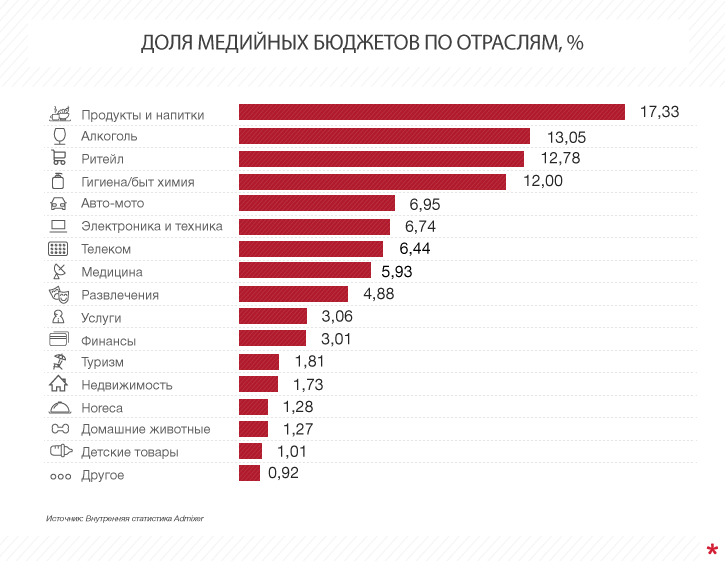 Самыми активными рекламодателями в первом полугодии 2016-го стали бренды из категорий «продукты», «алкоголь» и «ритейл». Эти отрасли не только сохранили свои места в рейтинге по сравнению с первой половиной 2015 года, но и увеличили доли в общем рекламном пироге.