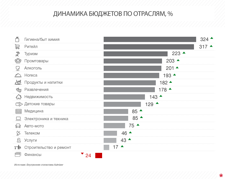Рост бюджетов по сравнению с прошлым годом произошел во всех категориях, кроме «финансов». При этом в большинстве отраслей затраты на медийную интернет-рекламу увеличились за год более чем в два раза.