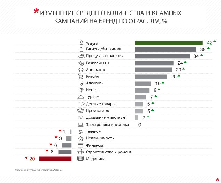 По сравнению с прошлым годом, в рейтинге отраслей свои позиции утратили лишь две категории — «телеком» и «финансы». Мобильные операторы были очень активны в первой половине 2015-го, что связано с выводом на рынок 3G и проведением ребрендингов. В этом году рекламные бюджеты телекома продолжили рост, но гораздо меньшими темпами, чем в среднем по рынку. Банковский и финансовый сектор по-прежнему находятся в кризисе, что существенно сказывается на активности рекламодателей из данного сегмента.