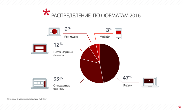 Благодаря высоким темпам роста за последний год видеореклама вышла на первое место по собираемым рекламным бюджетам среди медийных форматов. По итогам первого полугодия доля видеоформатов (in-stream + in-page) составила 47% и заняла заслуженное первое место. Позиция видео продолжит укрепляться и дальше за счет прихода новых рекламодателей из ТВ, увеличения бюджетов на этот канал и активного использования этого формата e-commerce проектами.