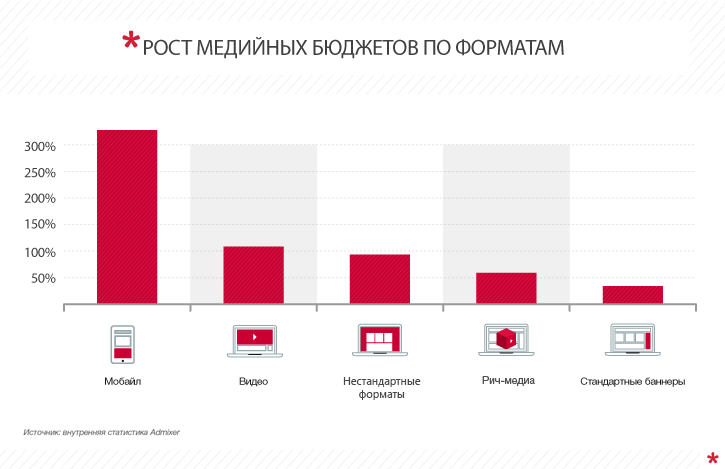 В этом сегменте еще сохраняется очень большой потенциал для роста, так как около 25% бюджетов на баннерную рекламу и около 10% бюджетов видеоразмещений пока тратятся в рамках рекламных кампаний, направленных на пользователей всех устройств, что снижает их эффективность для мобильных пользователей.