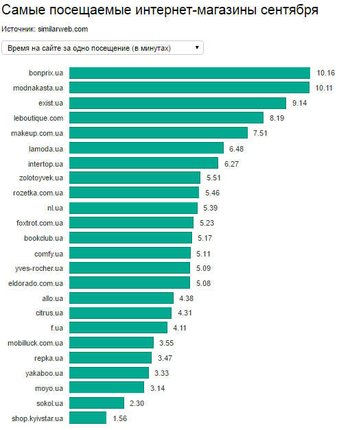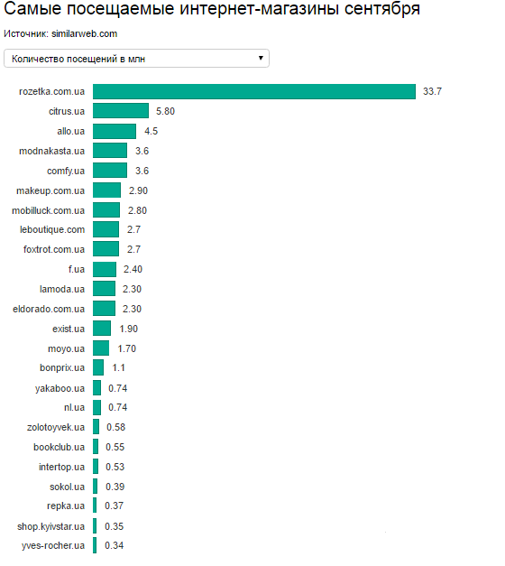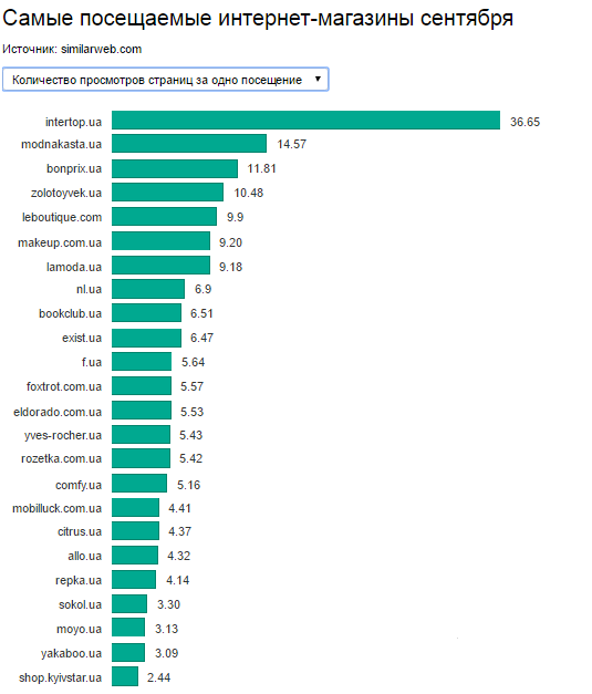 У лидера рейтинга Rozetka.ua количество посещений в сентябре сократилось на 6,96% и составило 33,7 млн. Сitrus.uа за то же время увеличил количество просмотров на 0,3 млн и уверенно удерживает второе место. Аудитория Allo.ua сократилась на 0,3 млн посещений, но компания осталась на третьем месте. ModnaKasta.ua потеряла первое место по времени, проводимому пользователями на сайте: ее вытеснил BonРrix (в среднем 10,16 мин). По количеству просмотров с большим отрывом лидирует интернет-магазин обуви Intertop.ua, у которого за одно посещение пользователь просматривает 37 страниц.