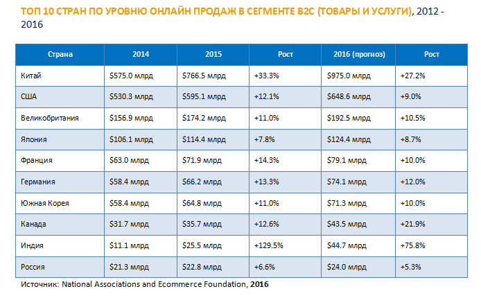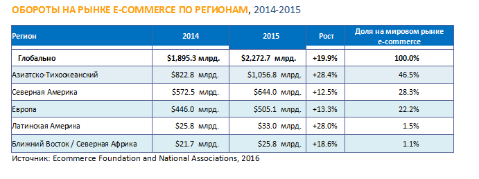 На 2016 год прогнозируется рост рынка на 17,5%, который найдет свое выражение в цифре $2,7 трлн оборота на всемирном рынке онлайн-коммерции в сегменте В2С. Для сравнения, эта цифра равна ВВП таких стран, как Франция или Великобритания.