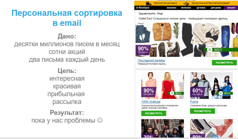 В шопинг-клубе занимаются тестированием персонализации в email-рассылках. Каждый месяц подписчикам отправляется до 100 млн писем. При этом первые 5 баннеров генерируют до 50% переходов на сайт. «Мы подумали, что очень важно сделать так, чтобы каждый пользователь видел наиболее интересные для него баннеры — так мы сможем сгенерировать больше переходов на сайт, а значит, увеличить объем продаж», — говорит Шилова.