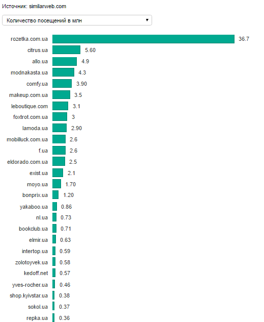 О рейтинге: Рейтинг составляется на основе открытых данных сервиса SimilarWeb. В рейтинг крупнейших интернет-магазинов попадают любые интернет-магазины, зарегистрированные в Украине, с ежемесячной посещаемостью не менее 300 000 в месяц. Если вы знаете о таком магазине и не видите его в рейтинге, то напишите его название нам в редакцию по адресу: info@retail-community.com.ua или в комментариях к этой заметке.