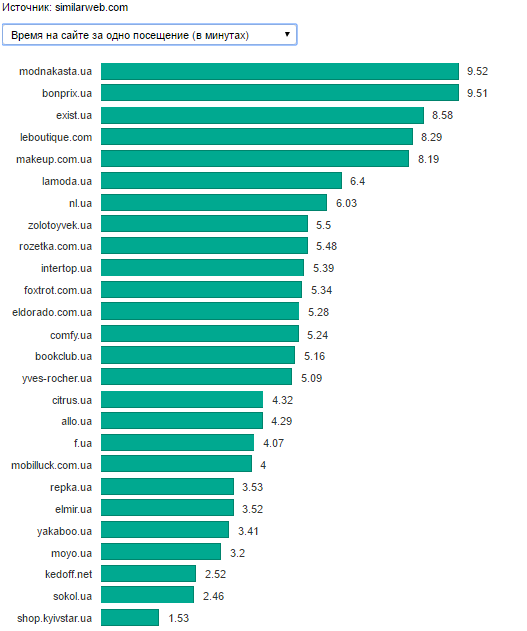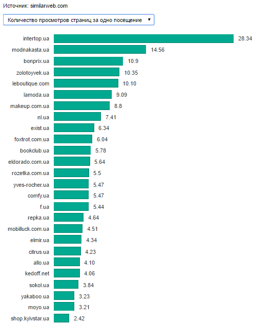 У лидера рейтинга Rozetka.ua количество посещений после падения в сентябре в октябре выросло на 3 млн и составило 36,7 млн. Сitrus.uа за то же время сократил количество просмотров на 2,68% и уверенно удерживает второе место. Число посещений Allo.ua выросло на 0,4 млн, но компания осталась на третьем месте. ModnaKasta.ua вернула первое место по времени, проводимому пользователями на сайте (в среднем 9,52 мин). По количеству просмотров с большим отрывом лидирует интернет-магазин обуви Intertop.ua, у которого за одно посещение пользователь просматривает 28 страниц.