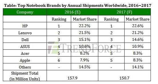 Что же касается ноутбуков, то в 2016-м здесь ожидается падение поставок на 4% — до 157,9 млн единиц. В следующем году отгрузки, по прогнозам TrendForce, сократятся еще на 4,5%, опустившись до отметки 150,7 млн единиц. Наибольшим спросом, как ожидается, будут пользоваться продукты HP, Dell и Lenovo.