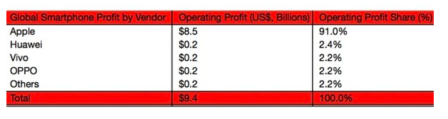 В мире насчитывается более 1 000 производителей смартфонов, но лишь один из них получает практически всю прибыль, генерируемую отраслью. По данным экспертов Strategy Analytics, в третьем квартале 2016 года на долю Apple пришелся 91% от всей операционной прибыли, полученной компаниями, выпускающими смартфоны. Еще в прошлом году доля Apple составляла «только» 65%