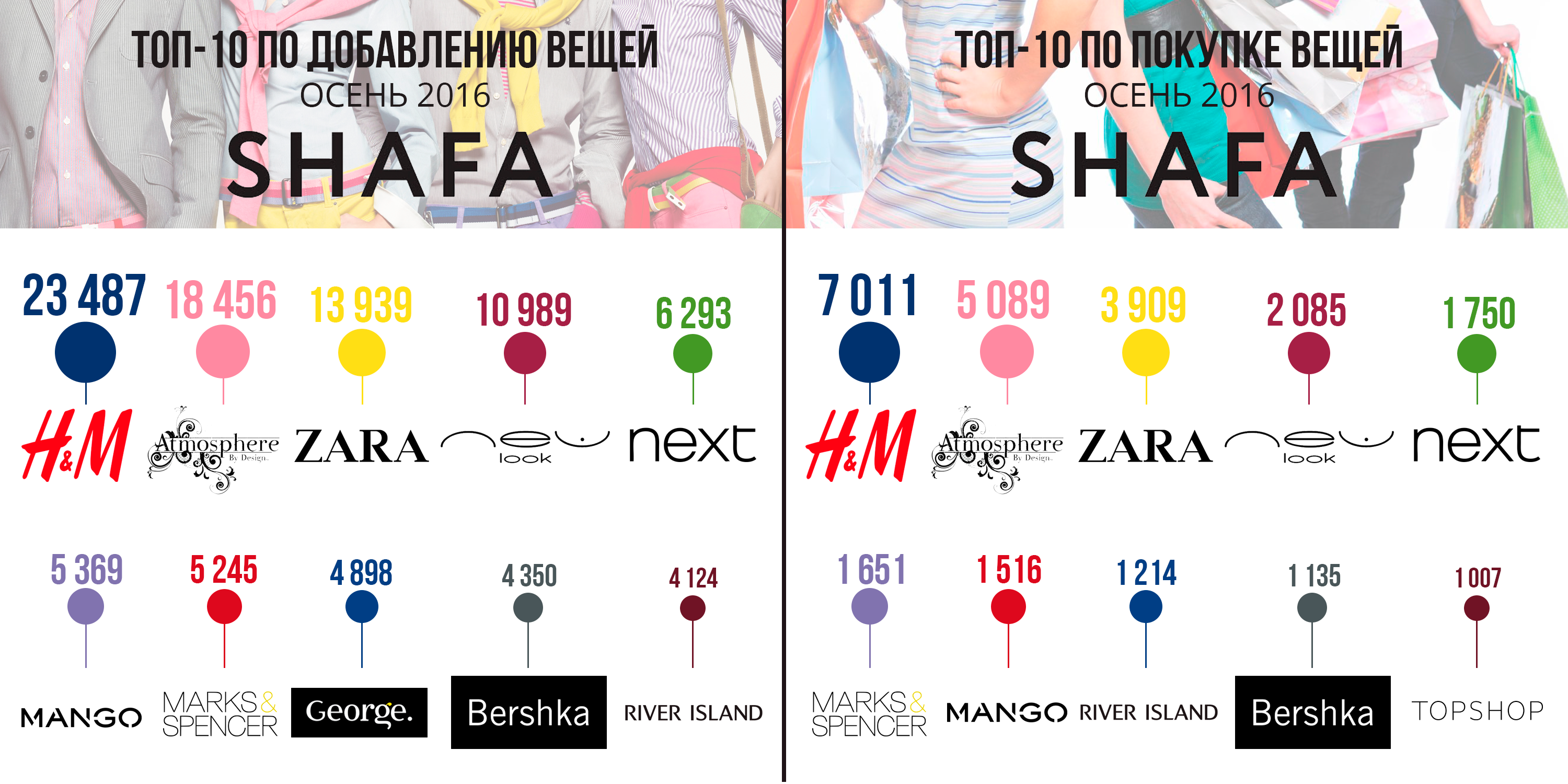 Как можно видеть, шведский бренд H&M стал абсолютным лидером как среди выставленных на продажу товаров, так и по количеству купленных вещей на платформе Шафа. При этом H&M является одним из двух брендов в списке, которые не имеют официальных розничных представительств на территории Украины. Более того, H&M — это единственный бренд рейтинга, который в принципе никогда не был представлен в Украине официально. Второй бренд, River Island, в 2014 году закрыл все магазины в Украине.