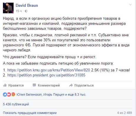 Ассоциация предприятий информационных технологий Украины (АПИТУ) подготовила законопроект, которым предусматривается снижение предельной цены международных отправлений, не облагаемых таможенными пошлинами, со 150 до 22 евро. Свою поддержку законопроекту выразил глава фискальной службы Роман Насиров. Лидеры мнений и рядовые украинцы инициативу не поддержали и призвали бойкотировать компании, которые входят в АПИТУ