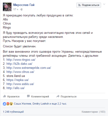 Пост о бойкоте, который разместил Мирослав Гай, получил более 2 200 лайков и 1 249 публикаций.