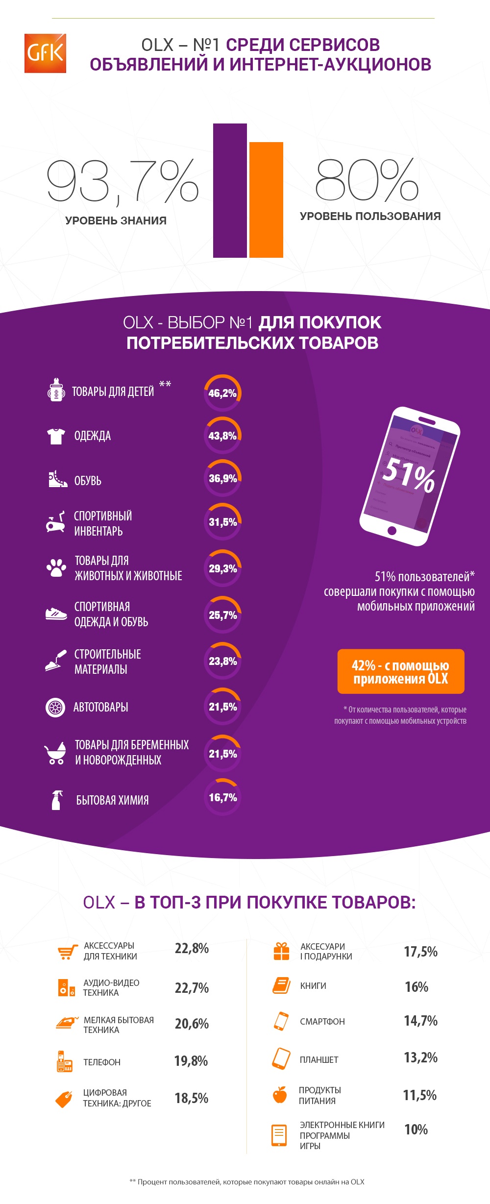 Согласно GfK, OLX сохраняет позиции лидера среди ресурсов объявлений и интернет-аукционов. О нем знают 94% украинцев, которые совершают покупки онлайн. Уровень пользования OLX достигает 80% — именно столько пользователей отметили, что за последние 12 месяцев они покупали через OLX. Примечательно, что шопингом в интернете занимаются в основном люди с высшим образованием или даже научной степенью, зачастую — семейные и с детьми. Большинству до 45 лет. По уровню доходов их можно условно отнести к среднему классу.