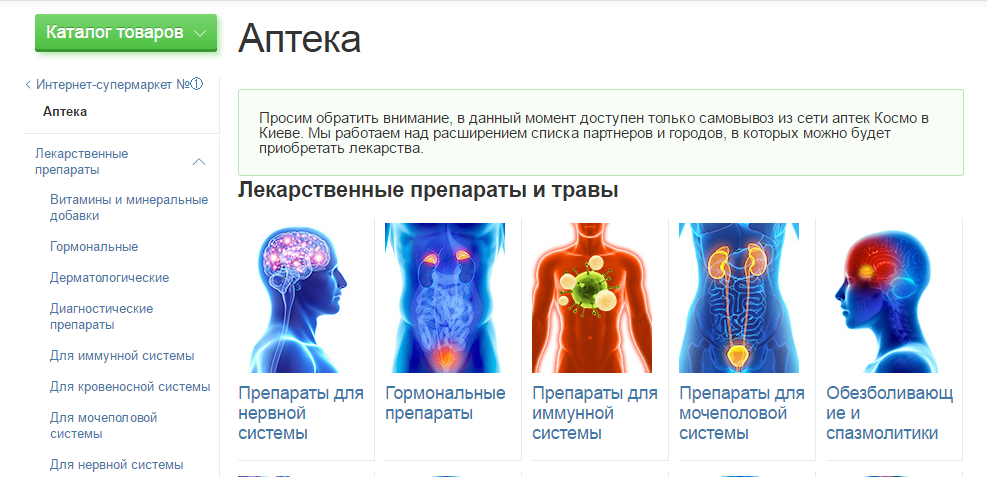 Пользователи интернет-магазина могут купить лекарственные препараты, травы и товары медицинского назначения. В данный момент доступен только самовывоз из сети аптек «Космо» в Киеве. Данное ограничение связано с тем, что украинское законодательство не предусматривают право на осуществление онлайн-торговли лекарственными средствами через интернет.