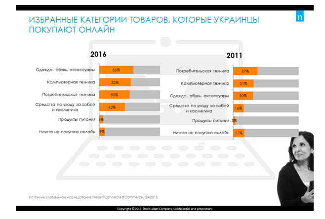 По мере того как проникновение интернета растет из года в год, меняется поведение потребителей и их отношение к покупкам онлайн. Категории товаров с сервисной поддержкой и товаров длительного пользования лидируют среди онлайн-покупок, а их популярность продолжает расти. Если в 2011 году 17% потребителей в Украине говорили, что не делают покупки онлайн, то в 2016 году доля потребителей, не покупающих онлайн, уменьшилась вдвое (9%). Среди тех украинцев, кто заявил, что делает покупки в интернете, каждый второй сказал, что покупает через интернет-магазины одежду, обувь и аксессуары (56%), компьютерную (52%) и потребительскую технику (50%). Дальше в рейтинге категорий идут товары по уходу за собой и косметика — 42% потребителей покупают эти товары онлайн. Покупка упакованных продуктов питания пользуется популярностью у каждого четвертого (24%) глобального потребителя. В Украине только 6% потребителей заявили, что покупают упакованные продукты питания в интернете и 5% регулярно делают покупки свежих продуктов онлайн.