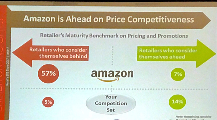 По данным исследования EKN’s Adaptive Pricing Promotions & Markdowns, большинство американских офлайн- и онлайн-ритейлеров считают себя неконкурентоспособными с Amazon по вопросам ценообразования. Такие результаты озвучил представитель компании EKN во время ежегодной выставки в Нью-Йорке NRF Retail's BIG Show