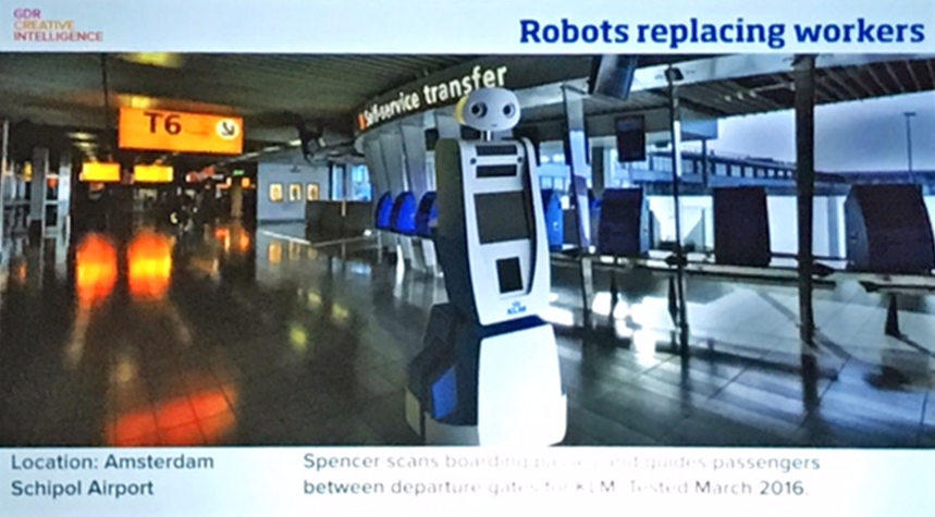 Роботы с системой сканирования посадочных талонов сопровождают пассажиров между зонами отправления. Система протестирована в марте 2016 года. Место применения: аэропорт в Амстердаме