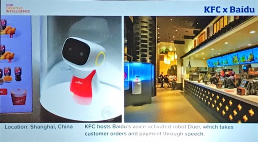 KFC создали робота Duer с голосом веб-системы Baidu, который принимает заказы посетителей и совершает оплату через голосовую систему. Место применения: Шанхай, Китай.