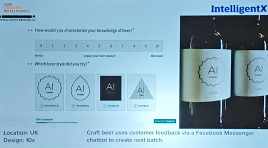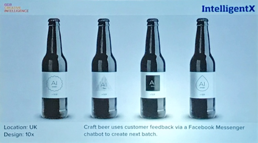 IntelligentX. Компания Craft beer принимает отзывы покупателей через чат-бота в мессенджере Facebook, чтобы создать следующий дизайн бутылки пива. Место применения: Великобритания. Дизайн: 10х.
