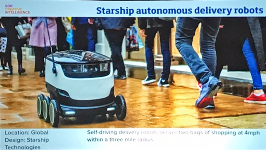Самоуправляемые роботы доставки Starship привозят два пакета покупок со скоростью четыре мили в час и с радиусом в три мили. Место применения: во всем мире. Дизайн: Starship Technologies.