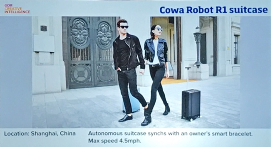 Чемодан Cowa Robot R1. Самоуправляемый чемодан синхронизируется со смарт-браслетом владельца. Максимальная скорость чемодана — 4,5 мили в час. Место разработки: Шанхай, Китай.
