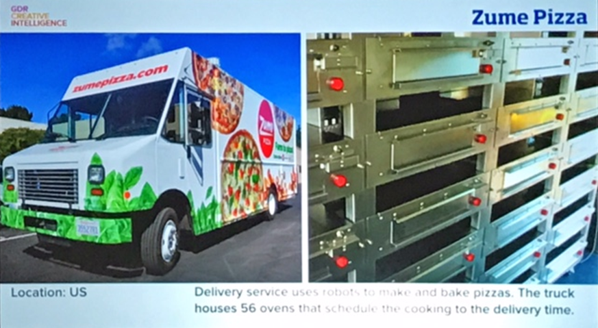 Пицца Zume. Сервис доставки использует роботов, чтобы делать и печь пиццы. Грузовик вмещает 56 печей, которые подстраивают процесс приготовления пиццы к ее времени доставки. Место разработки: США.