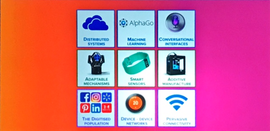 Какие технологии будут использоваться: облачные системы дистрибуции, обучение машин (AlphaGo), взаимодействие с голосовым управлением, адаптирующиеся механизмы, умные сенсорные системы, аддитивное производство 3D-моделей, digital-приложения (Instagram, Facebook), системы связи от одного устройства к другому, широко распространенная сеть связи (Wi-Fi).